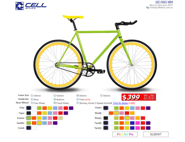 项目: CELL BIKES 自行车DIY定制系统; 客户: 澳洲知名品牌 CELLBIKES,专业生产高档自行车/高档骑行服装备,臂套、腿套、鞋套护具; 技术: ActionScript3.0 JavaScript UI Design 目的: 软件可进行自行车颜色的diy,同时生成订单; 增加购物体验,从而提高产品销量; 为自行车爱好者提供自由定制的平台,满足用户对于个性化的希望;