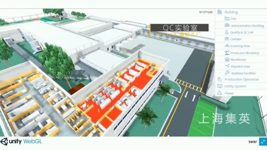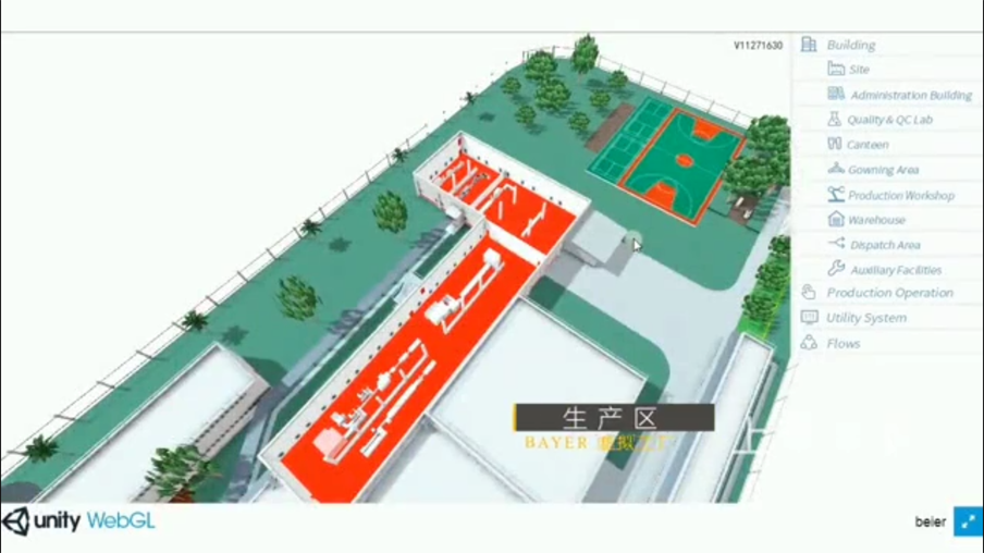 - 在3D模型上,通过构造完整的使用场景,包括行政楼、实验室、生产区、仓库、辅助房、更衣室、食堂以及生产线的内部设施构造;