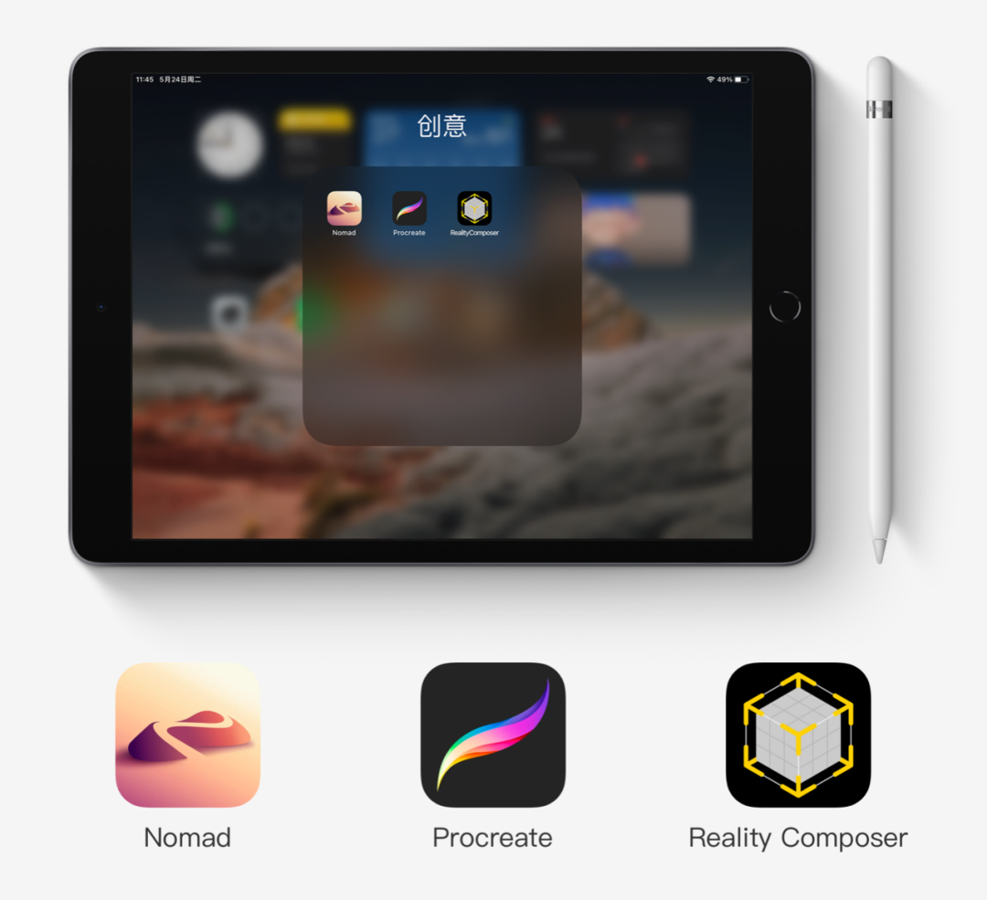 首先我们需要准备一台iPad和一支Apple Pencil,所使用到的应用有Nomad(数字雕刻建模软件)、Procreate(绘画应用软件)、Reality Composer(增强现实创作工具)。